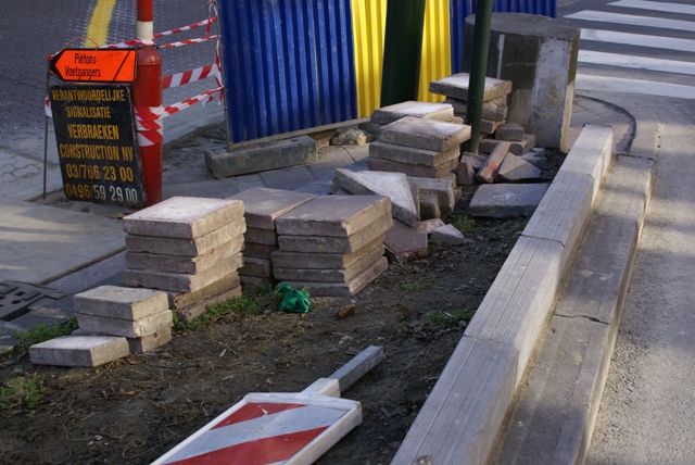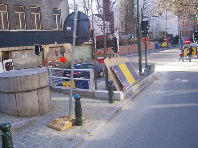 Le 1er février 2008, le quartier a donc très mal vécu l’intervention d’ouvriers de l’entreprise Verbraeken qui se sont mis à faire des trous n’importe comment, au milieu du flot piéton et automobile, à entasser des dalles, déblais et autres matériels sans aucun égard pour l’environnement. L’espace de l’arbre en particulier a servi de dépotoir temporaire. L’arbre lui-même a réchappé de peu aux mouvements sauvages d’un grappin monté sur un camion de chantier. Et puis Verbraeken a laissé le désordre derrière lui pour un week-end largement prolongé jusqu’au 7 février. Bien évidemment, l’AQL a d’abord veillé à la sécurité des riverains, mise en péril par un chantier abandonné sans passages sécurisés pendant 7 jours (voir l’article « Des travaux qui commencent mal »).