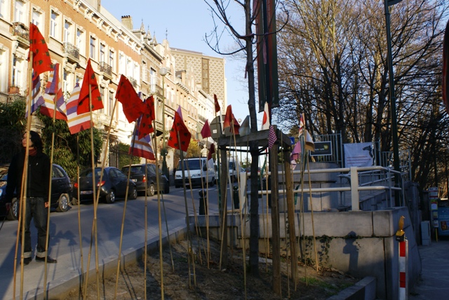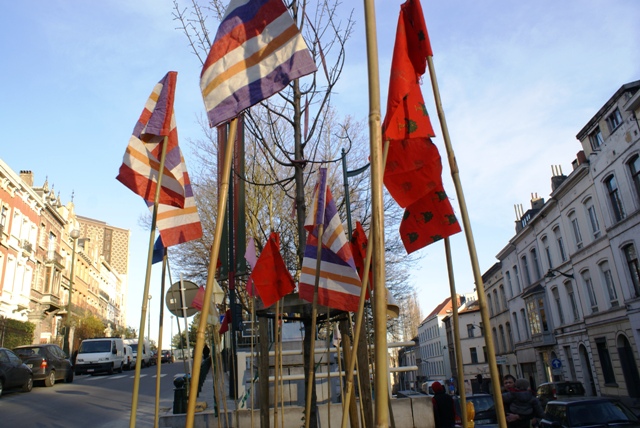 Dans le courant du dernier week-end, les habitants de la rue ont réagi en décidant de marquer symboliquement le territoire de l’Arbre. Le samedi 16 février, un groupe qui participait à Saint-Gilles à la séance de formation au logiciel SPIP qui gouverne le blog d’Ariane, est revenu rue Vautier avec 16 bambous et surtout de drapeaux « de la ménagère » pour former un premier buisson de protection autour de l’arbre. Dimanche, deux jeunes de la rue se sont affairés à compléter le dispositif avec 14 autres bambous et autant de drapeaux confectionnés dans des tissus de rideaux. Ce faisant, ils lancent un appel aux parlementaires et aux agents du Parlement Européen qui sont également des riverains : à leur retour de Strasbourg ce jeudi 24 février, ils peuvent « officialiser » l’importance de l’Arbre à Vœux en plantant autour de l’arbre des petits et grands drapeaux bleus à 12 étoiles d’or. Nous sommes tous des citoyens européens dans ce quartier !