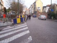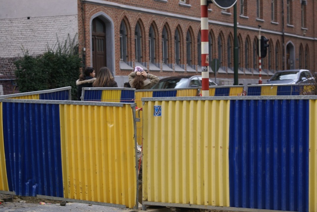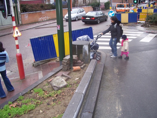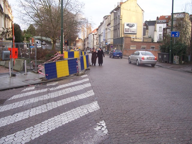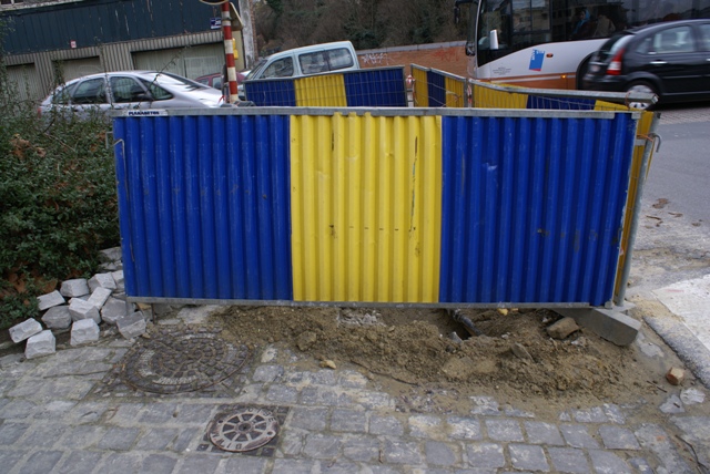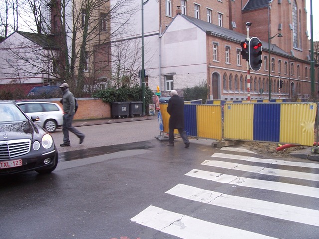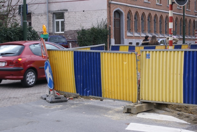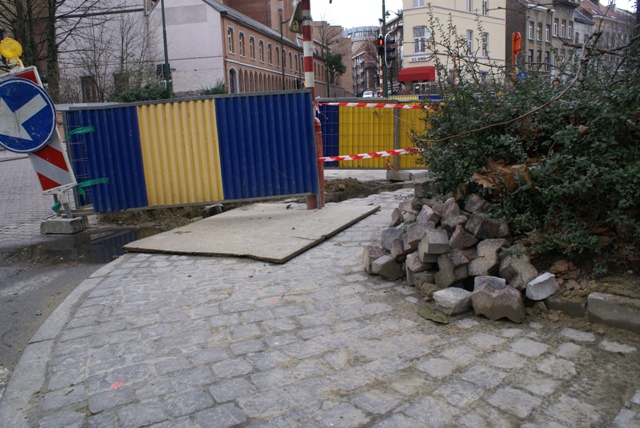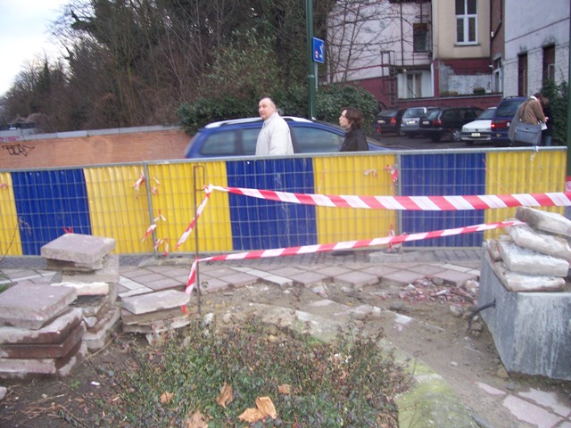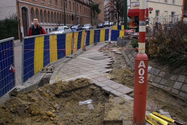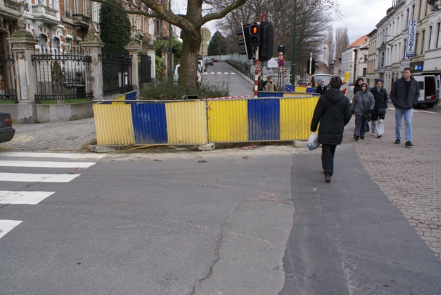 Pendant son week-end prolongé du 1er au 7 février, VERBRAEKEN a laissé ses trois trous livrés aux enfants et piétons de passage. Pendant 7 jours, ceux-ci ont pu contourner les palissades et se retrouver au milieu des voitures de la chaussée de Wavre ou de la rue Wiertz. Les passages pour piétons aboutissent aux trous Verbraeken. Pas de cheminement sécurisé pour les piétons. Par contre, les ouvriers de Verbraeken n’avaient pas oublié d’apposer une belle flèche routière sur un de leurs panneaux au coin Wiertz-Wavre pour indiquer obligeamment leur chemin aux automobilistes encombrés par des piétons.
