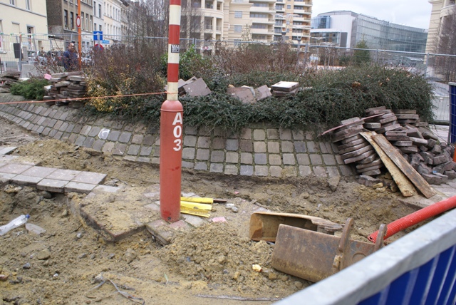 Thésée, pourvu du fil d’Ariane en matière de sécurité quotidienne des enfants et des riverains, a pris quelques photos. Mais il n’a pas pu suivre le fil des entreprises et des donneurs d’ordre, en l’absence de panneau précisant le nom et l’adresse de l’entreprise qui creuse des trous et entrepose des pavés, dalles et autres sur les arbustes et sur les espaces publics normalement réservés aux piétons. Il n’y avait pas non plus de panneau indiquant le nom et le téléphone du coordinateur de sécurité, mention pourtant obligatoire depuis une ordonnance bruxelloise de 2002 et une directive européenne de 1996…