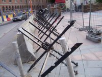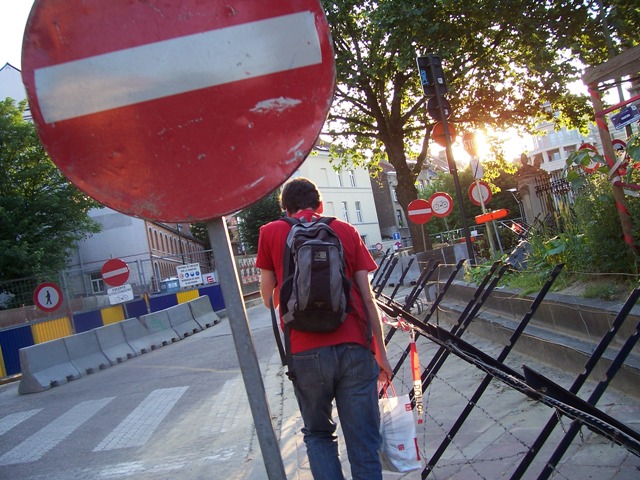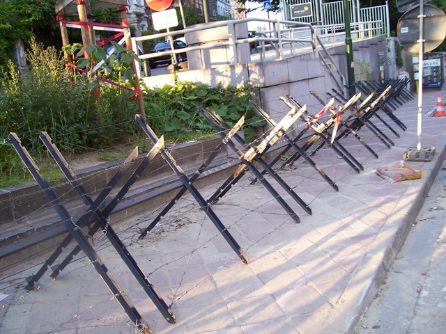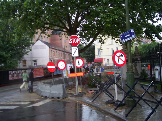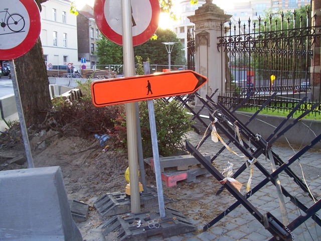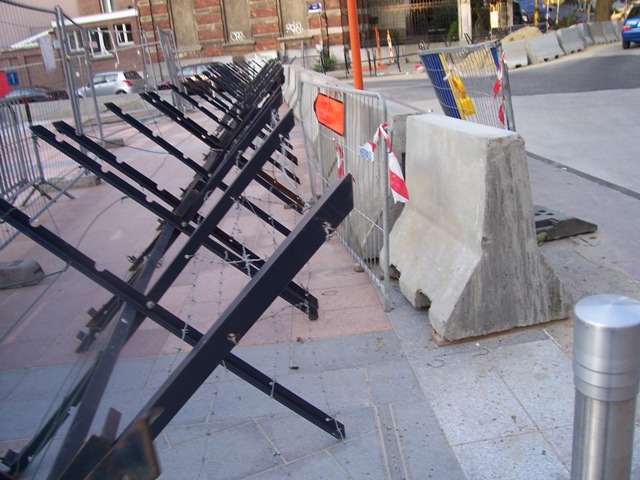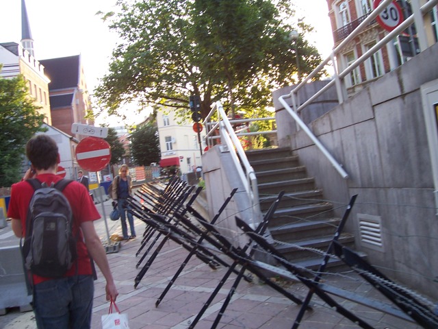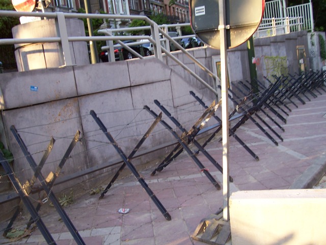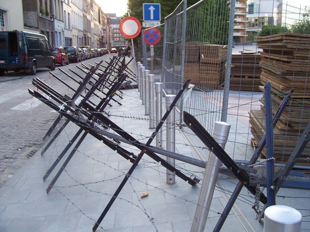 Le lundi 16 juin, des dizaines de mètres de chevaux de frise ont été déposés rue Wiertz, rue Godecharle, rue Vautier et sur le pont Wavre. Ces chevaux de frise sont destinés à assurer la sécurité lointaine et préventive des Chefs d’Etat européens qui se réunissent les 19 et 20 juin au Juste Lipse, à 500 m à vol d’oiseau. Ce faisant, l’Officier mandaté par le Ministère de l’Intérieur et par le Chef de Corps de la zone de Police Bruxelles-Ixelles, n’était pas doté d’ordres actualisés tenant compte des travaux en cours sur le pont Wavre, depuis janvier 2008. Il avait ordre de déposer ses 50 mètres de chevaux de frise. Il les a donc déposés sur tous les cheminements piétonniers qui contournent les travaux. Dès lors, les usagers faibles, c’est à dire les centaines de piétons et cyclistes, sont rejetés sur la chaussée, où ils sont en conflit avec les voitures et bus qui arrivent en face. Les conducteurs ne sont pas prévenus de cette situation à risque. De plus, des véhicules empruntant le sens unique de la rue Wiertz, continuent à se confronter avec les véhicules autorisés à descendre la chaussée de Wavre.